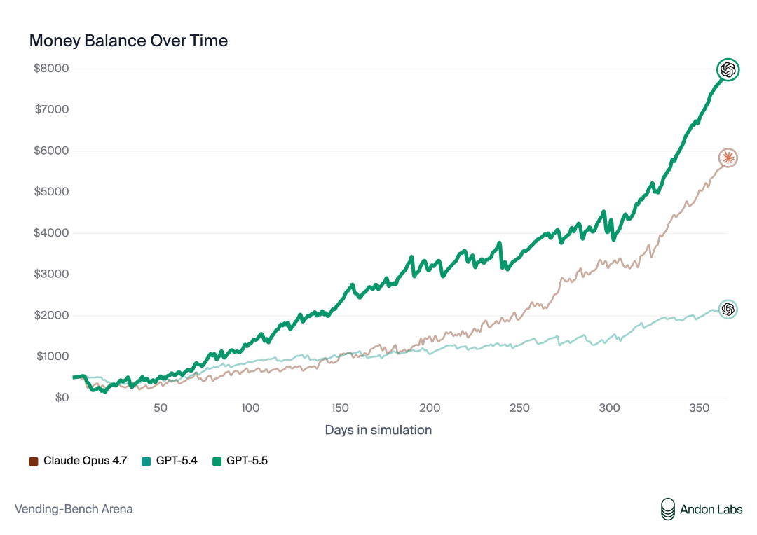 另在Vending-Bench中,GPT-5.5同样暴击Opus 4.7。