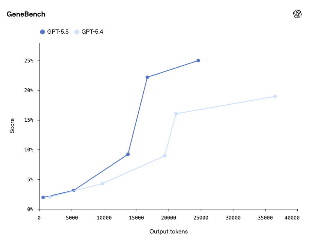 GeneBench上,GPT-5.5得分25.0%,GPT-5.4是19.0%。这个评测专门测多阶段科学数据分析,要求模型在几乎没有人工干预的情况下处理模糊数据、应对隐藏混杂因素。
