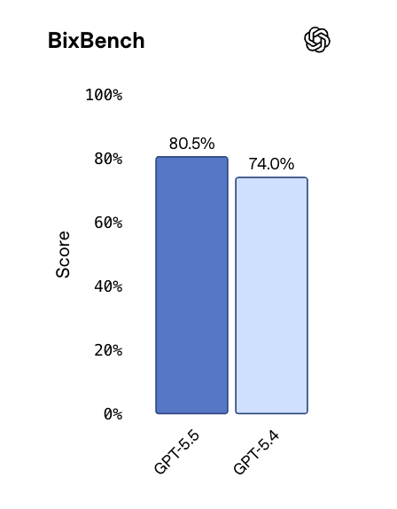 BixBench,基于真实生物信息学设计的评测,GPT-5.5在所有已公开分数的模型中排名第一,80.5%。