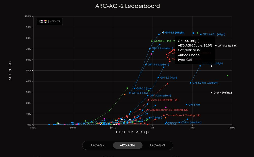 在AAI测试中,相同输出token下,GPT-5.5智能指数冠绝全球;另在ARC-AGI-2上,同样刷新了SOTA。