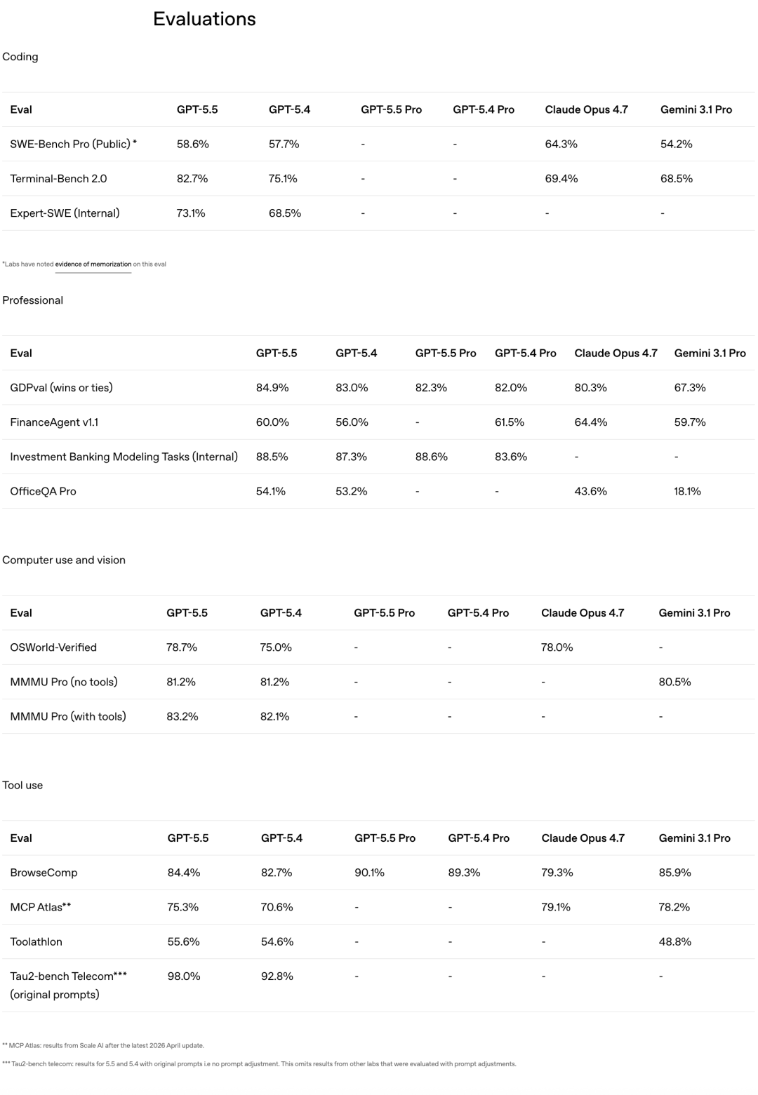 GDPval,评估AI在44个职业中完成规范知识工作的水平,GPT-5.5拿到84.9%,Opus 4.7是80.3%,Gemini 3.1 Pro只有67.3%。