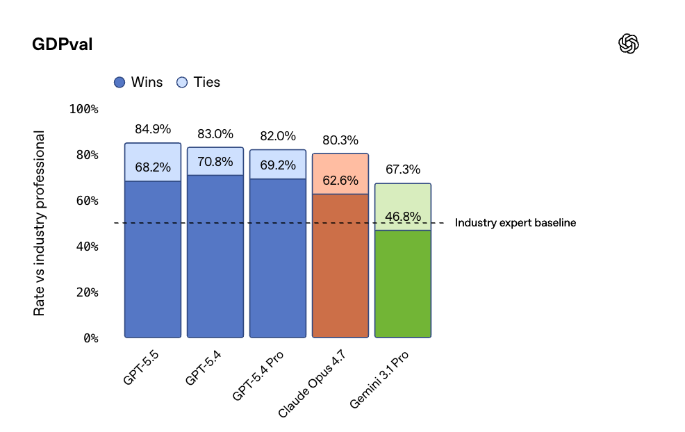 编程之外,GPT-5.5在「知识型工作」上的数据同样亮眼。